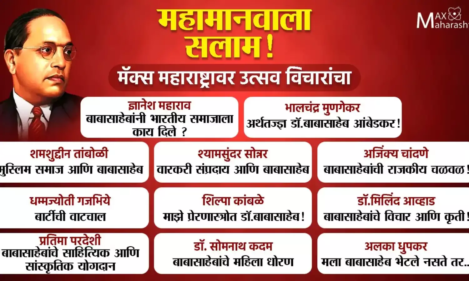 डॉ.बाबासाहेब आंबेडकर यांच्या जयंतीनिमित्त मॅक्स महाराष्ट्रने विचारांचा खास उत्सव आयोजित केला आहे. विविध विचारवंत, साहित्यिक, तज्ज्ञ यांच्या नजरेतून बाबासाहेब आंबेडकर यांचे विचार, त्यांचा समाजाला झालेला फायदा आणि या विचारांची आज असलेली गरज, यासर्व मुद्द्यांवरील वैचारिक मंथन १४ एप्रिल रोजी दिवसभर आपण ऐकू आणि पाहू शकता....