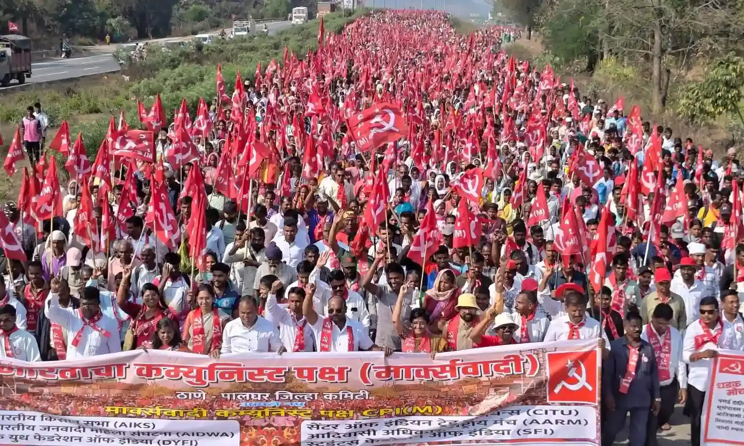 Palghar Long March पालघर जिल्ह्यातील आदिवासी, शेतकरी, मच्छीमार आणि कष्टकऱ्यांनी १९ जानेवारी २०२६ पासून एकजुटीने भव्य पायी मोर्चा काढला. मार्क्सवादी कम्युनिस्ट पक्ष (माकप) आणि किसान सभेच्या नेतृत्वाखाली हा लाँग मार्च डहाणू तालुक्यातील चारोटी नाक्यापासून सुरू होऊन पालघर जिल्हाधिकारी कार्यालयापर्यंत पोहोचला. या मोर्चात ५० हजार लोक असून हे लाल वादळ आपल्या मागण्यांसाठी रस्त्यावर उतरला आहे. जोपर्यंत सरकारच्या वतीने निश्चित कालमर्यादेसह लेखी स्वरूपात आपल्या ज्वलंत आणि प्रलंबित मागण्या मान्य केल्या जात नाहीत तोपर्यंत हा प्रचंड जनसमुदाय पालघर जिल्हाधिकारी कार्यालयासमोर अनिश्चित काळासाठी धरणे आंदोलन करणार आहे. असं अजित नवले यांनी म्हटलं आहे.