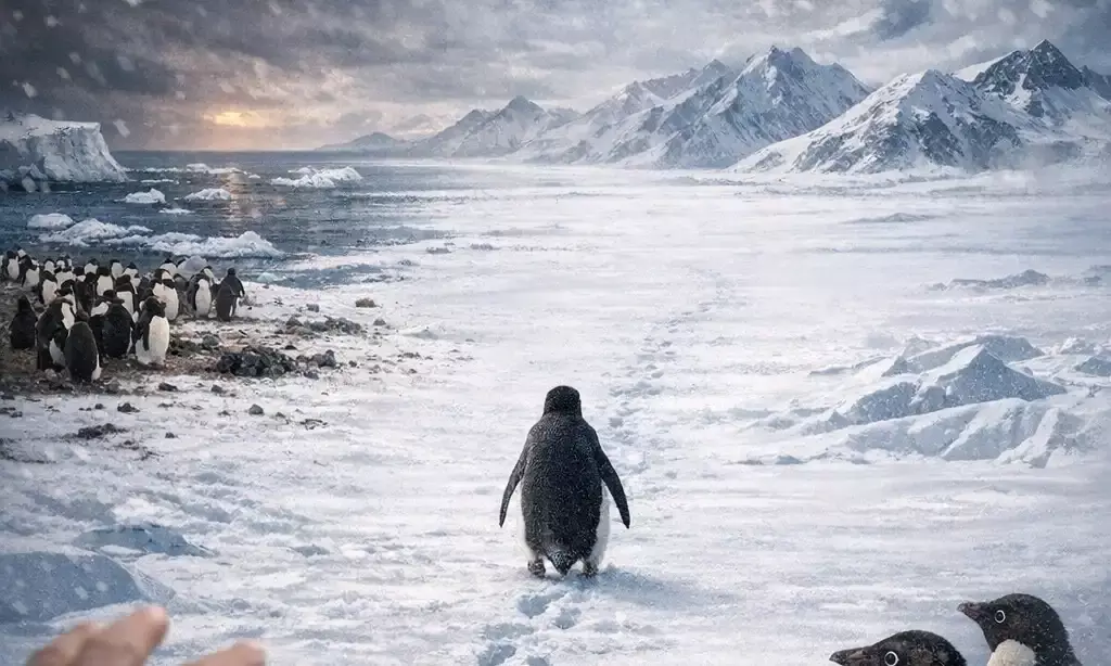 ही क्लिप अंदाजे २००७ ची आहे, वर्नर हर्झॉग यांच्या माहितीपट Encounters at the End of the World मधून. यात एक Adélie पेंग्विन आपल्या वसाहताजवळ उभा असताना इतर पेंग्विन समुद्राकडे जातात, पण हे पेंग्विन आतल्या भागात चालू लागतो. बर्फ, हिम, दूरवर डोंगर कोठेही अन्न किंवा आश्रय नाही. पेंग्विन न थांबता एकट्याने चालत राहतो. हर्झॉगच्या वर्णनानुसार हा मार्ग जगण्यापासून दूर जाणारा आहे आणि परत येणे अशक्य आहे. दिग्दर्शकाने हा क्षण लांबपर्यंत कॅमेरा न घेता संपवला, त्यामुळे यात कोणताही ठोस निकाल दिसत नाही. या क्षणाचा अर्थ तेव्हाच लावला गेला होता, तोही पेंग्विनचा अभ्यास करणाऱ्या संशोधकांनी.