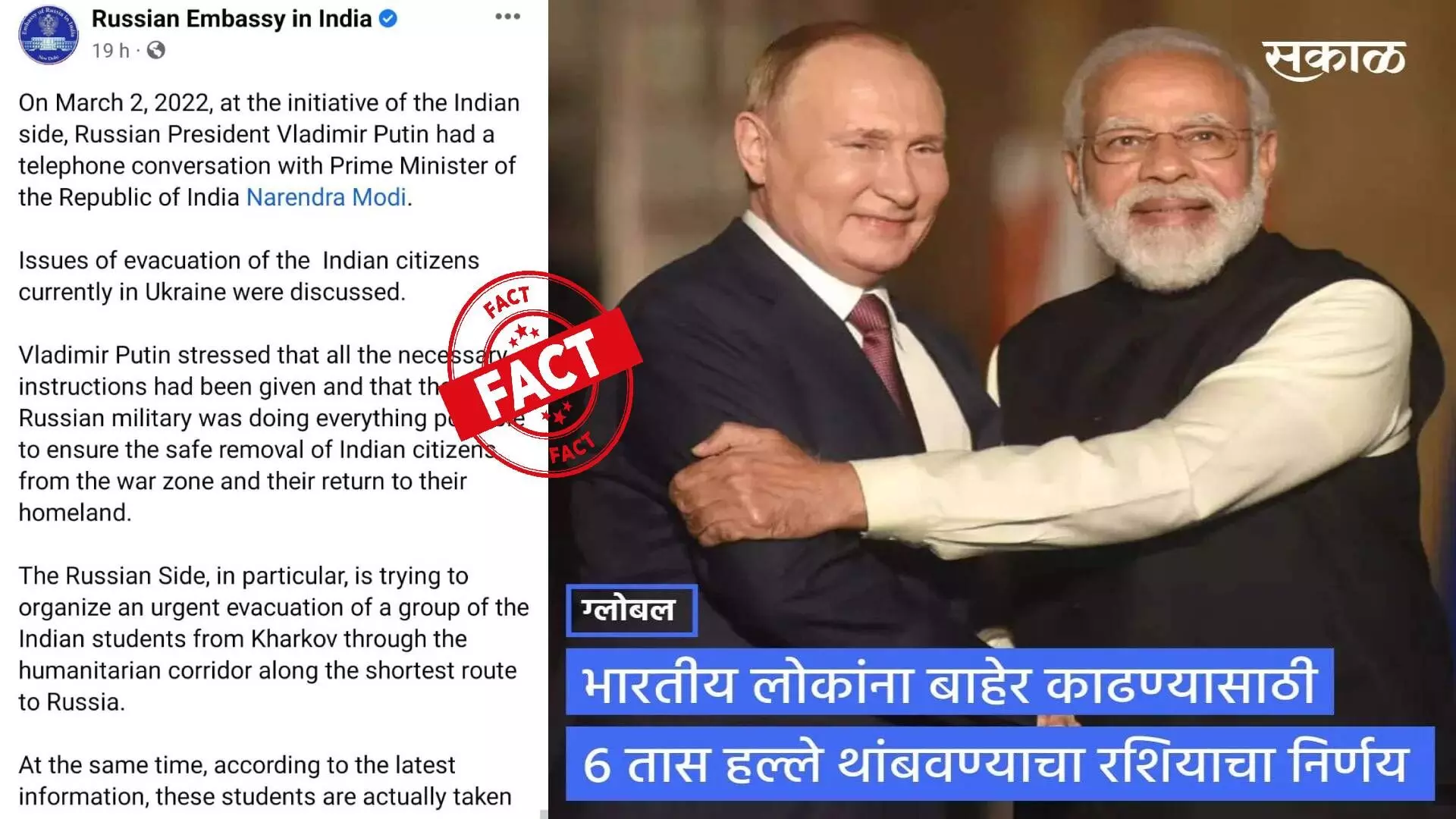 रशिया आणि युक्रेन युद्धादरम्यान पंतप्रधान नरेंद्र मोदी यांनी पुतीन यांच्याशी बातचीत केली म्हणून पुतीन यांनी भारतीय विद्यार्थ्यांना युद्धातून बाहेर काढण्यासाठी ६ तास युद्ध थांबवल्याचा दावा केला आहे. पण हा दावा खरा आहे का, जाणून घेण्यासाठी वाचा...