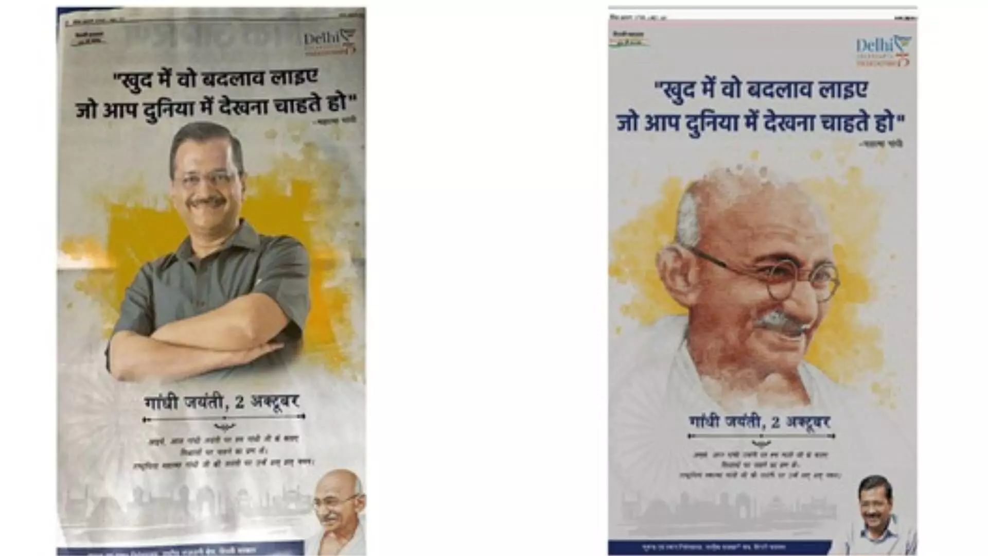 महात्मा गांधी यांच्या जयंती निमित्त Dainik Jagran/New Delhi Edition मध्ये दिल्ली सरकारने एक जाहिरात दिली होती. या जाहिरातीमधील एक कथित फोटो सध्या सोशल मीडियावर चांगलाच व्हायरल होत आहे. दरम्यान, या व्हायरल जाहिरातीमधील महात्मा गांधींचा फोटो लहान दाखवण्यात आला आहे तर दिल्लीचे मुख्यमंत्री अरविंद केजरीवाल यांचा फोटो मोठा असल्याचं अनेकांनी सोशल मीडियावर शेअर केलं आहे.