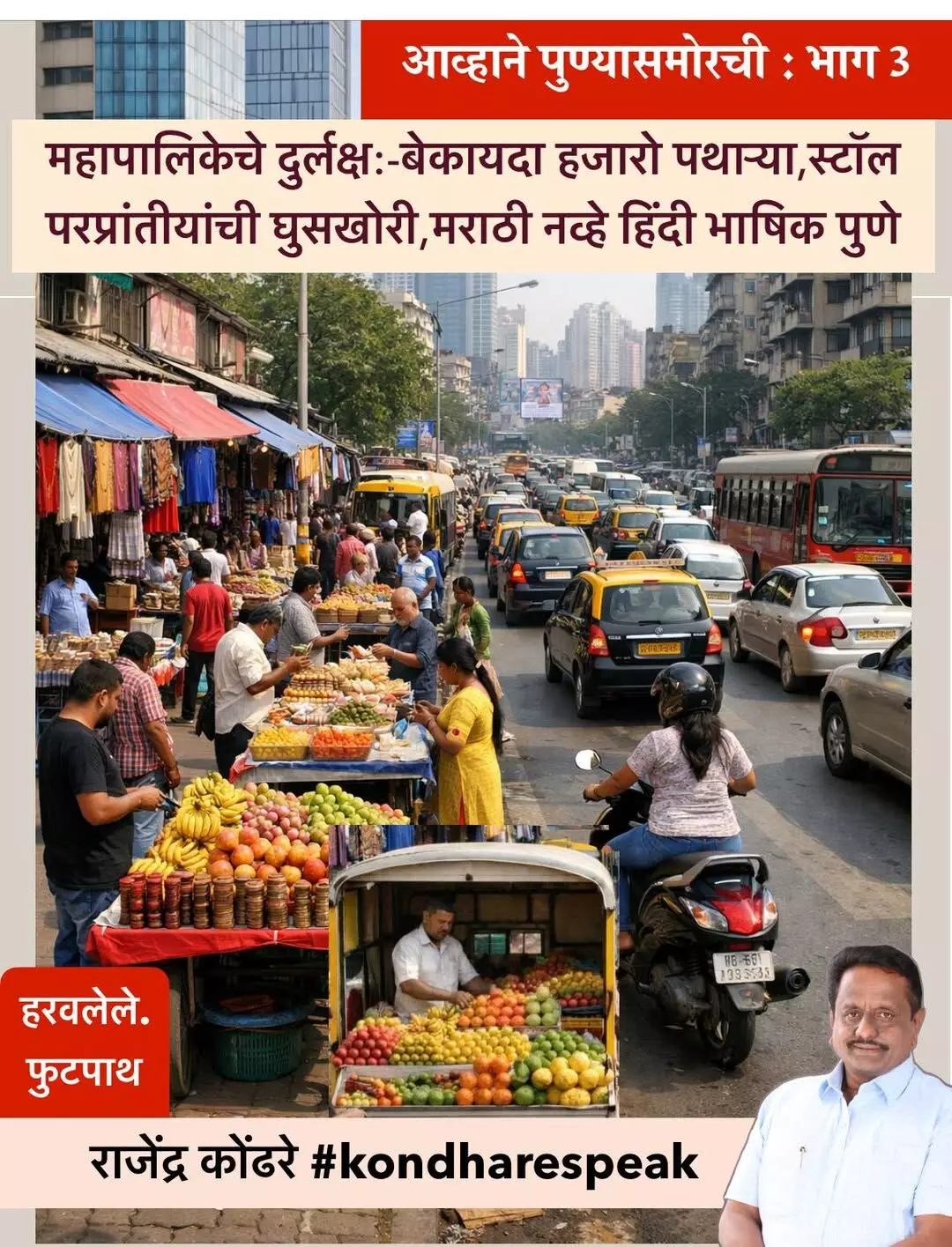 Migration Issues in Pune पुणे शहर व उपनगरामध्ये फुटपाथ, रस्त्यावर, इमारतींच्या फ्रंट मार्जिनमध्ये बेकायदा हजारो पथाऱ्या, Street Vendors स्टॉल, फळ विक्रेत्यांचे टेम्पो Illegal Vendors in Pune या माध्यमातून सुमारे 1.5 लाख परप्रांतीयांची घुसखोरी, मराठी नव्हे हिंदी भाषिकांची पुण्याकडे वेगवान वाटचाल सुरू आहे. यात मराठी माणसांपेक्षा युपी बिहार राजस्थानी कलकत्ता इत्यादी राज्यातून आलेल्या लाखो परप्रांतीयांनी बेकायदा पान स्टॉल, पाणीपुरी, चायनीज, 15 रुपयात कॅन्सर विकणारे ज्युस स्टॉल, मेवाड आइसक्रीमवाले, कलकत्ता बेस फ्रुटवाले टेम्पो यांनी पुण्याला घेरले आहे.Pune Municipal Corporation महापालिकेचे, स्थानिक नेते, मंडळांचे कार्यकर्ते यांच्या दुर्लक्षाने Mumbai मुंबई जेवढी Marathi मराठी माणसांच्या हातातून गेली त्यापेक्षा पुणे मराठी माणसांच्या हातातून जाण्याचा वेग प्रचंड आहे.