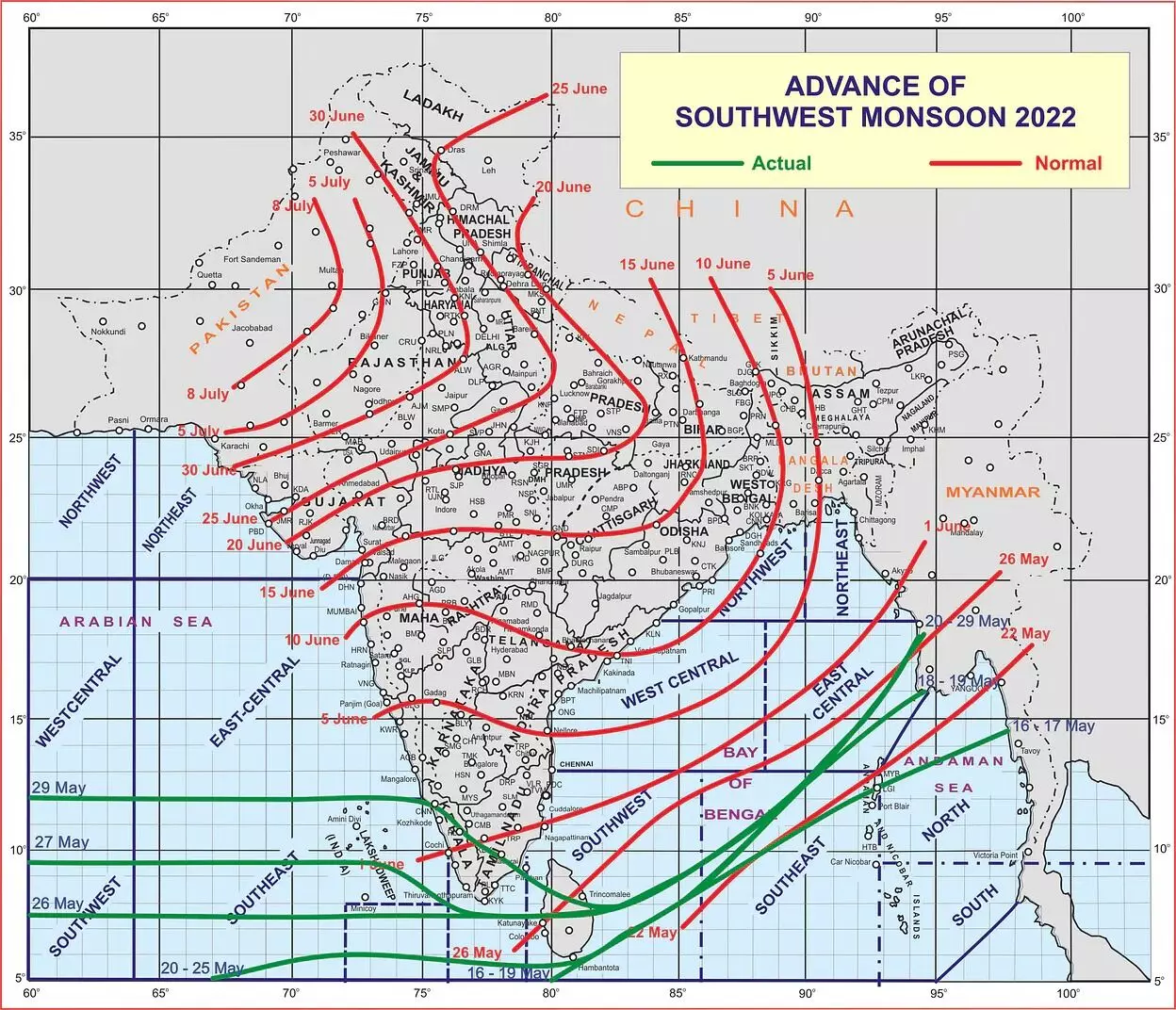 भारतीय हवामान खात्याने (IMD) १३ मे ला सांगितलेल्या बातमीनुसार देशात २०२२ चा मान्सून २७ मे ला अधिक व वजा ४ दिवसाच्या फरकाने म्हणजे उशिरात उशिरा म्हणजे ३१ मे पर्यंत अपेक्षित होता. मध्य संदर्भ चौकटीसाठी २७ मे तारीख विभागाकडून घोषित झाली. तारीख लक्षात ठेवली पण अधिक व वजा ४ दिवसाचा फरक लक्षात घेतला जात नाही. त्यानुसार मान्सून २९ मे ला केरळात दाखल झाला आहे.