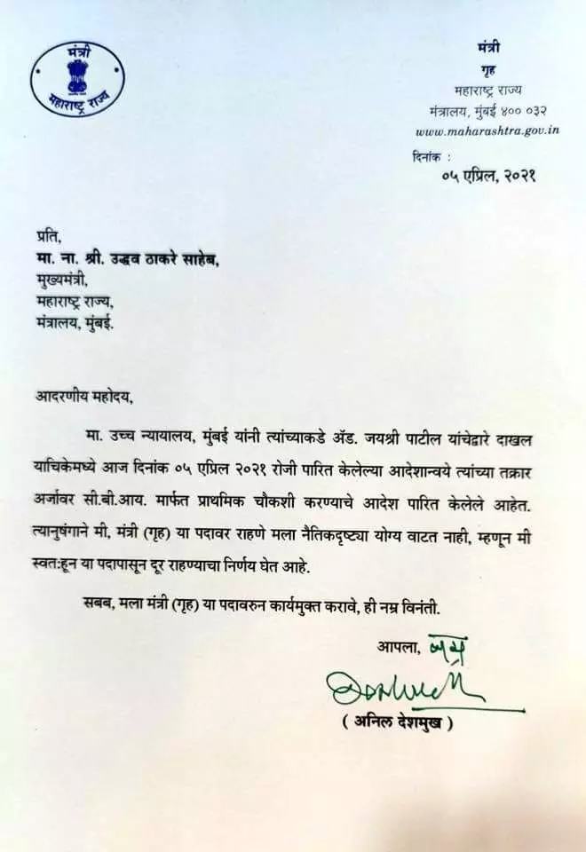 परमबीर सिंग यांनी हायकोर्टामध्ये या प्रकरणाची सीबीआयमार्फत चौकशी करण्याची मागणी केली होती, ही मागणी मान्य करत हायकोर्टाने सीबीआयमार्फत प्राथमिक चौकशी करून पंधरा दिवसात कायदेशीर कारवाईचे आदेश दिले आहे. आपल्यावरील आरोपांची सीबीआय चौकशी सुरू असल्याने त्या पदावर राहणे योग्य नाही, म्हणून आपण राजीनामा देऊ इच्छितो, असे अनिल देशमुख यांनी सांगितल्याचे नवाब मलिक यांनी म्हटले आहे. यानंतर पक्षाचे अध्यक्ष शरद पवार यांनी देखील अनिल देशमुख यांची राजीनामा देण्याची मागणी मान्य केली. त्यानंतर ते मुख्यमंत्र्यांकडे रवाना झाल्याची माहिती नबाब मलिक यांनी दिलेली आहे.