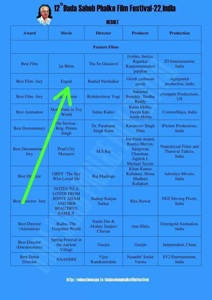 दादासाहेब फाळके फिल्म फेस्टिव्हलमध्ये भारतातून आणि जगभरातून 718 फिल्म आल्या होत्या. यामध्ये 'जय भीम' चित्रपटाला 'बेस्ट फिल्म अवार्ड' मिळला. तर 'बेस्ट फिल्म ज्युरी अवॉर्ड' इरगाल चित्रपटाला मिळाला आहे. बेस्ट अँक्टरचा अवॉर्ड 'तुफान' चित्रपटासाठी 'फरहान अख्तर' ला देण्यात आला. तर अमिताभ बच्चन यांनी अभिनय केलेल्या 'चेरी' फिल्म ला 'मेंशन अवार्ड' ने सन्मानित करण्यात आले. रशीद निंबाळकर यांनी दिग्दर्शित केलेल्या 'इरगाल' चित्रपटाची कथा मरीआईवाले समाजाच्या सत्य परिस्थितीवर आधारीत आहे. त्याने या चित्रपटातून या समाजाच्या वाट्याला आलेले दुःख, दारिद्र्य, त्यांची भीक मागताना होणारी परवड, त्यांना येणाऱ्या विविध अडचणीची मांडणी या केली आहे.