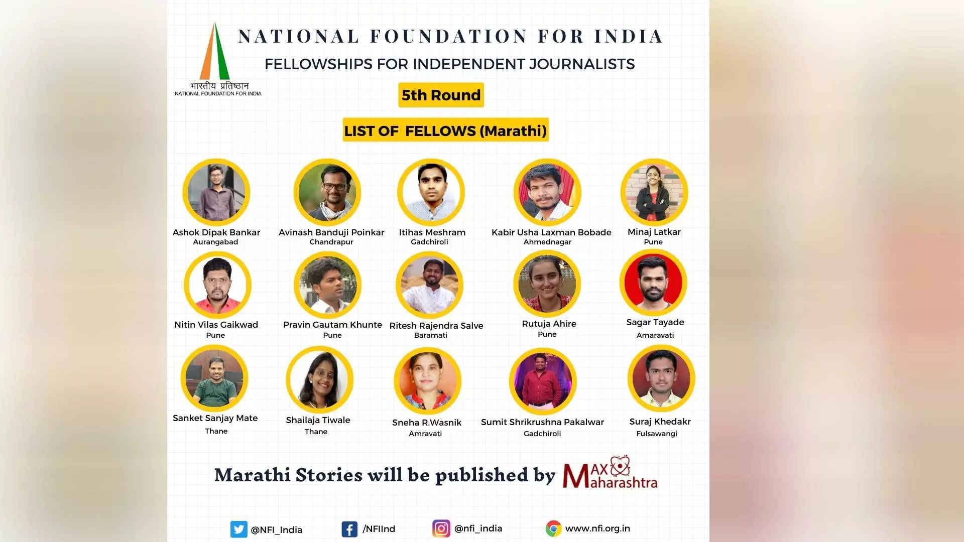 स्वतंत्र पत्रकारिता करणाऱ्या पत्रकारांना मुलभूत विषयांवर संशोधन करुन वार्तांकन करता यावे यासाठी National Foundation For India या संस्थेतर्फे फेलोशीप दिली जाते. मराठीमध्ये स्वतंत्र पत्रकारिता करणाऱ्या १५ पत्रकारांची निवड करण्यात आली आहे. या पत्रकारांचे स्पेशल रिपोर्ट्स मॅक्स महाराष्ट्रवर प्रकाशित केले जाणार आहेत.