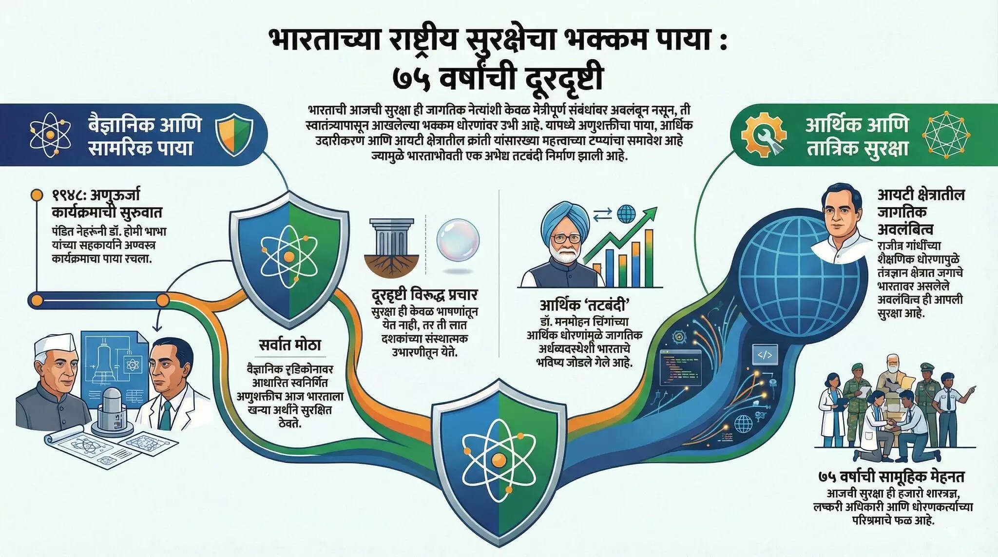 नेहरूंनी तेव्हा ओळखले होते की भविष्यात केवळ शांततेच्या तत्वज्ञानावर भाषणे देऊन देश सुरक्षित होणार नाही, तर वैज्ञानिक दृष्टिकोनावर आधारित स्वनिर्मित अणुशक्ती देशाला सुरक्षित ठेवेल. India military insurance nuclear weapons आज भारताची स्वतःची अण्वस्त्रे हाच आपला सर्वात मोठा लष्करी विमा आहे. देशाची सुरक्षा केवळ सीमा सुरक्षित करून थांबत नाही. India IT industry growthती अर्थव्यवस्थेतही असते. जागतिकीकरणामुळे आज भारताचा अमेरिकेसोबत प्रचंड मोठा व्यापार आहे. डॉ मनमोहन सिंग Manmohan Singh economic liberalization यांच्या दूरदृष्टीमुळे आर्थिक उदारीकरनंतर कित्येक बहुराष्ट्रीय कंपन्यांचे भविष्य भारताशी जोडलेले आहे.